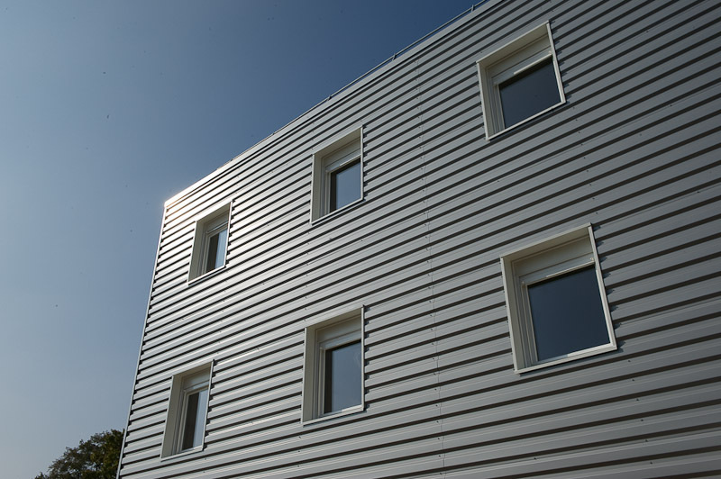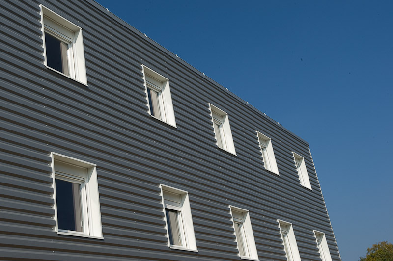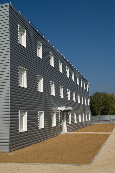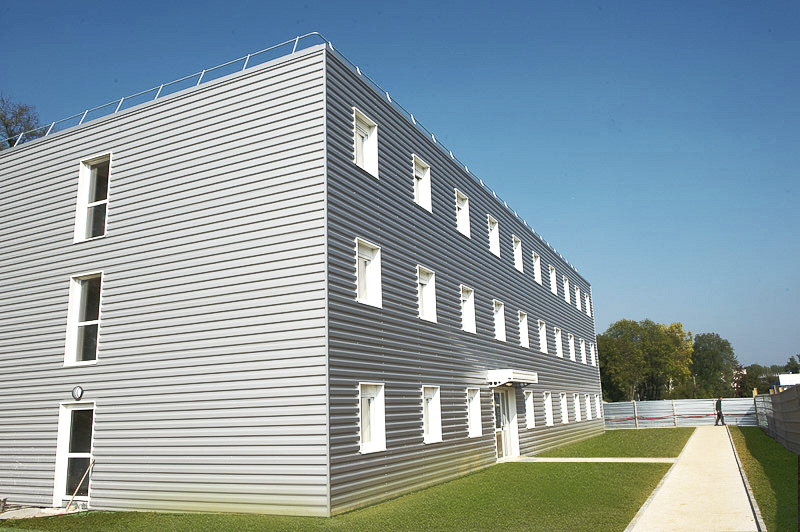 4 bâtiments de 1200 m2 chacun en R+2 Bardage métallique Toiture végétalisée Chambres avec sanitaires et salle d’eau individuelle