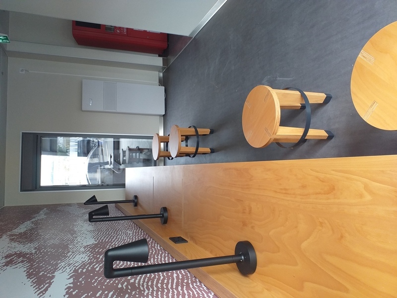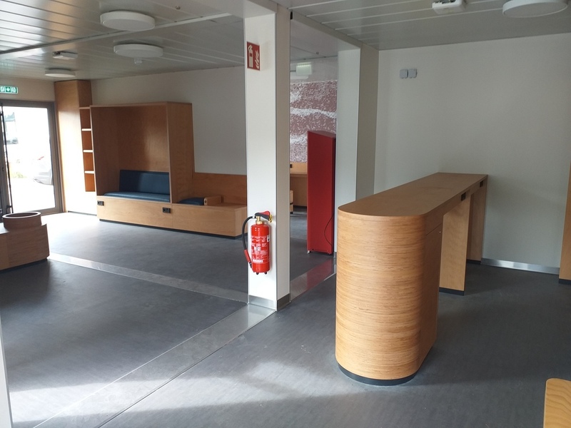 Mobiliers sur-mesure Grands espaces d’accueil au RDC Vestiaires et zone de réfectoire à l’étage Bardage métallique